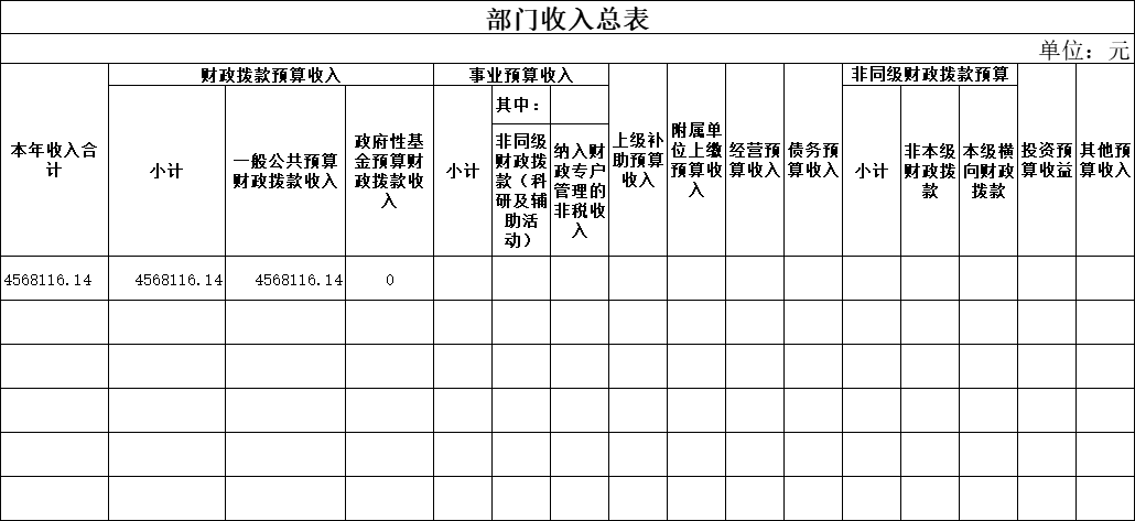 本年收入包括:财政拨款预算收入4568116.14元,占100%;事业预算收入0元,占0%;上级补助预算收入0元,占0%;附属单位上缴预算收入0元,占0%;经营预算收入0元,占0%;债务预算收入0元,占0%;非同级财政拨款预算收入0元,占0%;投资预算收益0元,占0%;其他预算收入0,占0%。