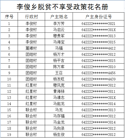 海原县李俊乡脱贫不享受政策花名册
