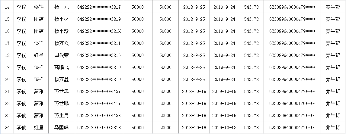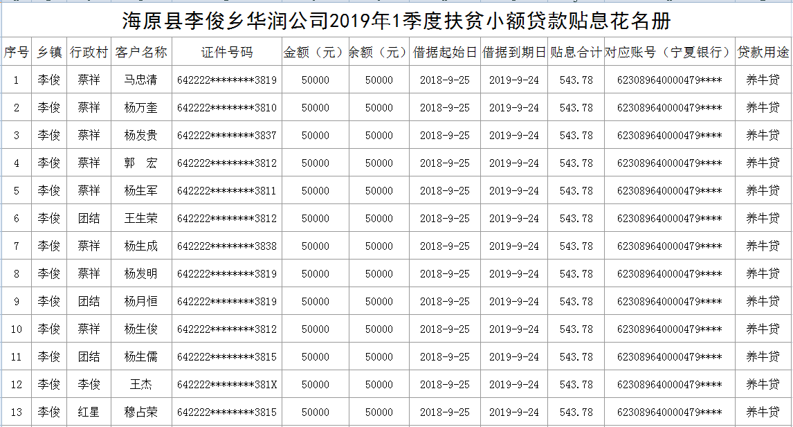 海原县李俊乡华润公司2019年1季度扶贫小额贷款贴息花名册