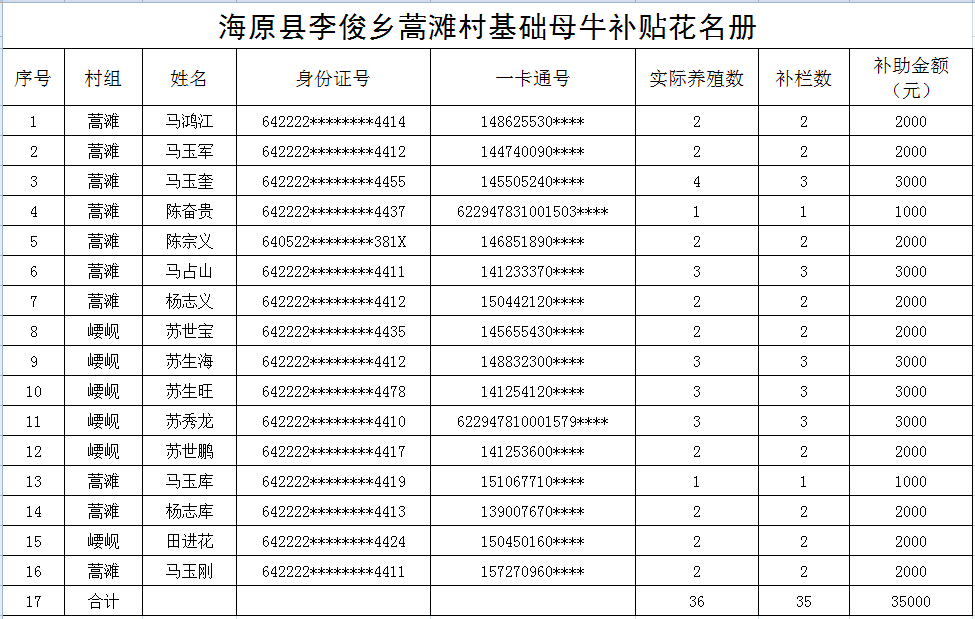 海原县李俊乡蒿滩村基础母牛补贴花名册