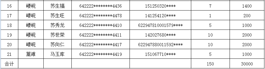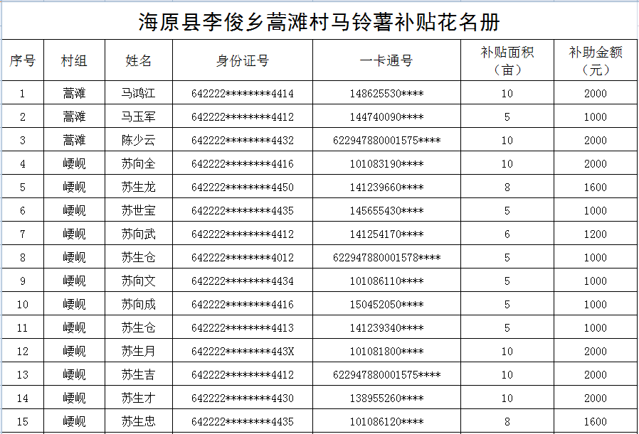 海原县李俊乡蒿滩村马铃薯补贴花名册
