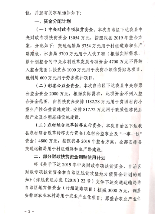 现将《关于下达2019年第二批中央财政专项扶贫资金、彩票公益金资金、农村综合改革转移支付资金使用计划和部分财政扶贫资金调整使用计划的通知》公示如下: