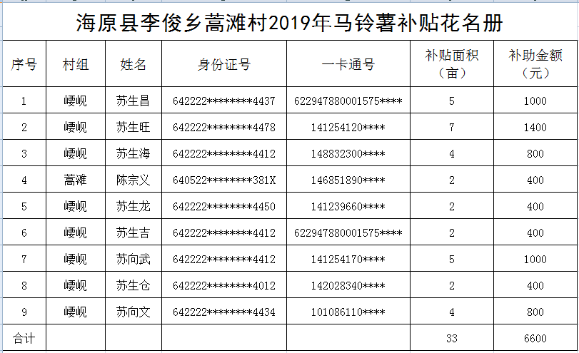 海原县李俊乡蒿滩村2019年马铃薯补贴花名册
