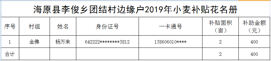 海原县李俊乡团结村边缘户2019年小麦补贴花名册