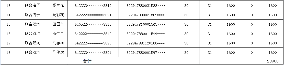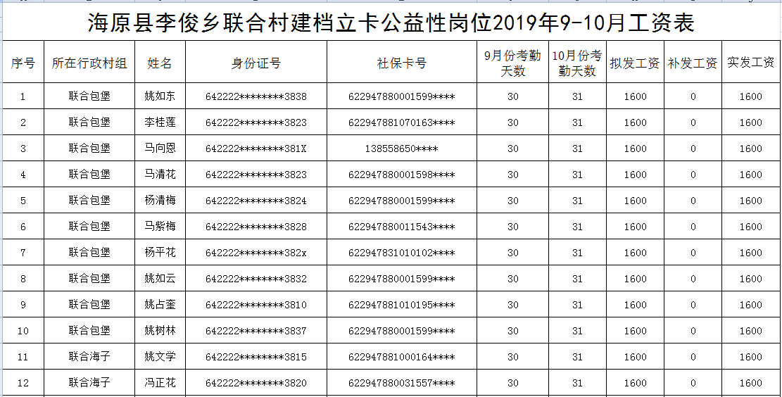 海原县李俊乡联合村建档立卡公益性岗位2019年9-10月工资表