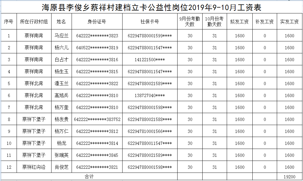 海原县李俊乡蔡祥村建档立卡公益性岗位2019年9-10月工资表