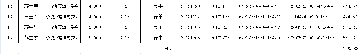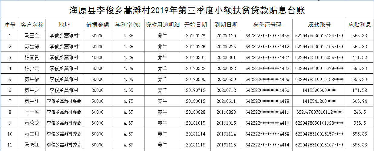 海原县李俊乡蒿滩村2019年第三季度小额扶贫贷款贴息台账