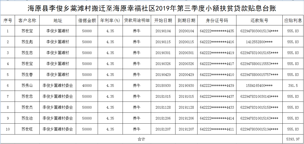 海原县李俊乡蒿滩村搬迁至海原幸福社区2019年第三季度小额扶贫贷款贴息台账