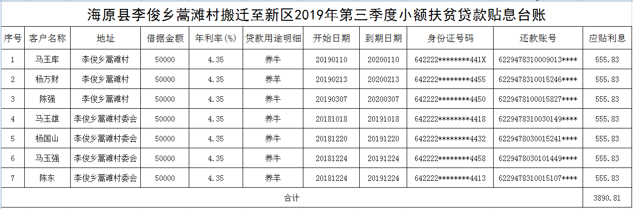 海原县李俊乡蒿滩村搬迁至新区2019年第三季度小额扶贫贷款贴息台账