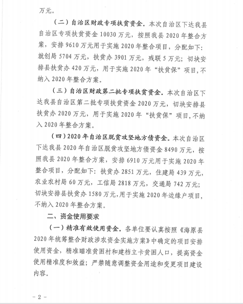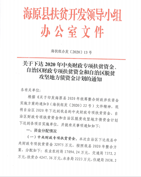 现将《关于下达2020年中央财政专项扶贫资金、自治区财政专项扶贫资金和自治区脱贫攻坚地方债资金计划的通知》公示如下: