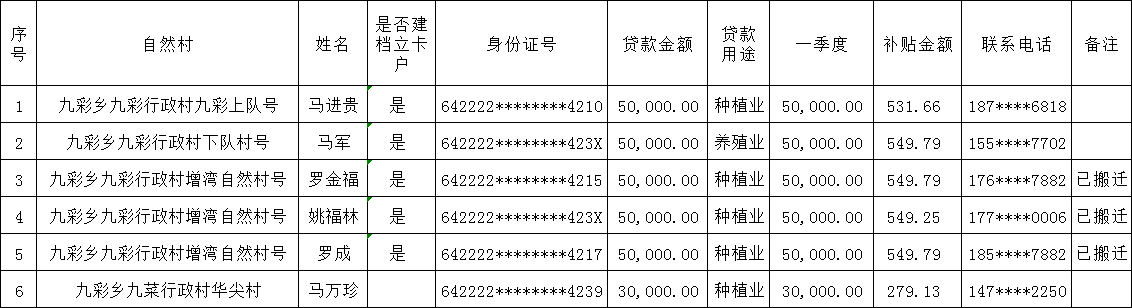 海原县九彩乡九彩村2020年1季度农行贷款贴息补贴花名册