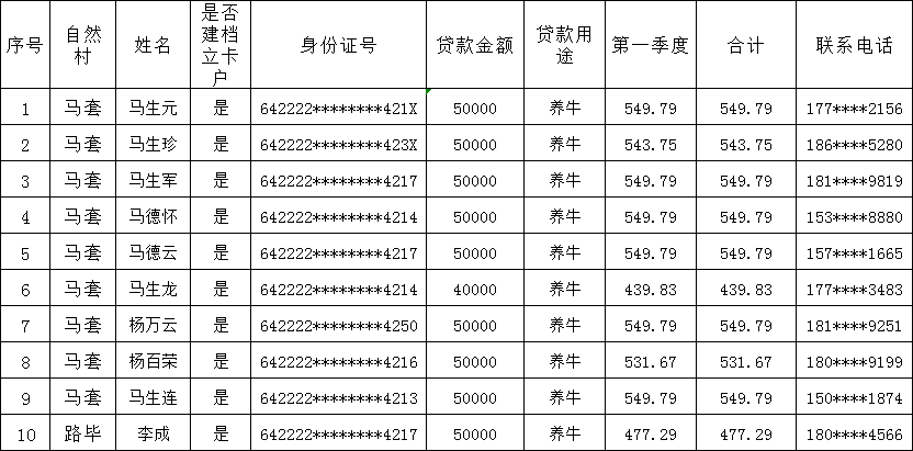 海原县九彩乡马套村2020年1季度信用社贷款贴息补贴花名册
