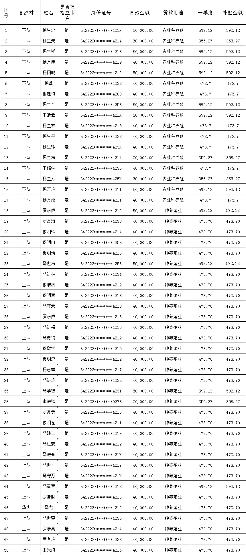 海原县九彩乡九彩村2020年1季度邮政贷款贴息补贴花名册