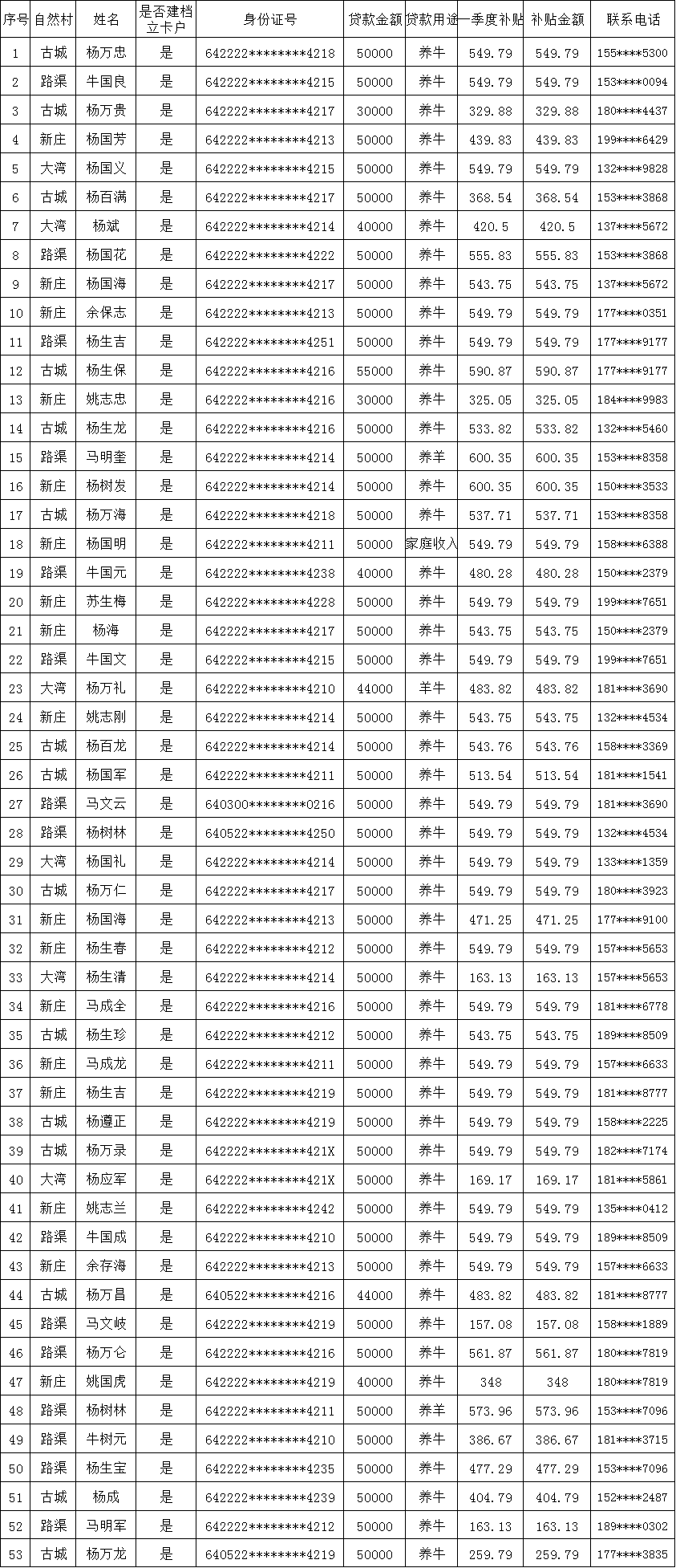 海原县九彩乡新庄村2020年1季度信用社贷款贴息花名册
