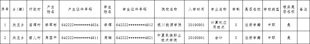 海原县关庄乡2020年春季学期边缘户雨露计划享受学生名单