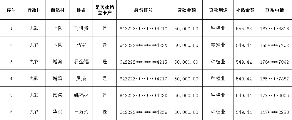 海原县九彩乡九彩村2020年第二季度农行贷款贴息补贴公示花名册