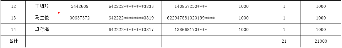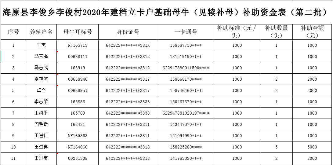 海原县李俊乡李俊村2020年建档立卡户基础母牛(见犊补母)补助资金表(第二批)