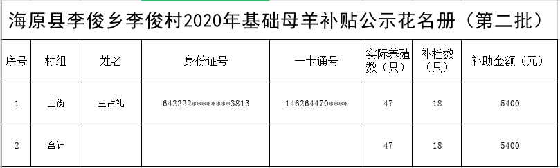 海原县李俊乡李俊村2020年基础母羊补贴公示花名册(第二批)
