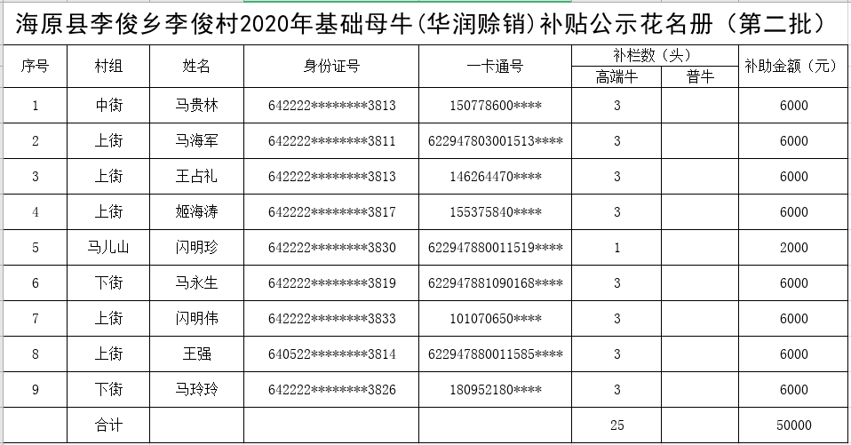 海原县李俊乡李俊村2020年基础母牛(华润赊销)补贴公示花名册(第二批)
