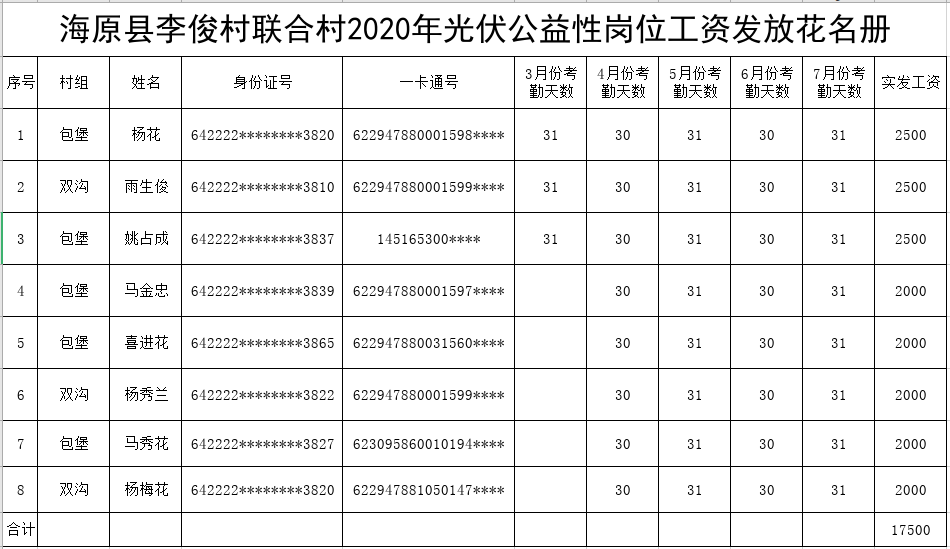 海原县李俊村联合村2020年光伏公益性岗位工资发放花名册