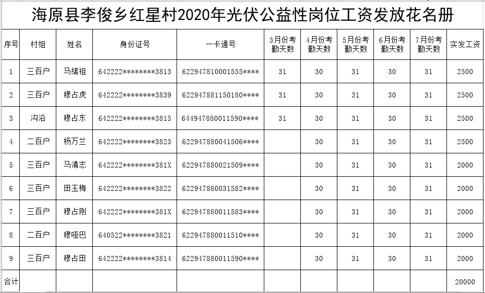 海原县李俊乡红星村2020年光伏公益性岗位工资发放花名册