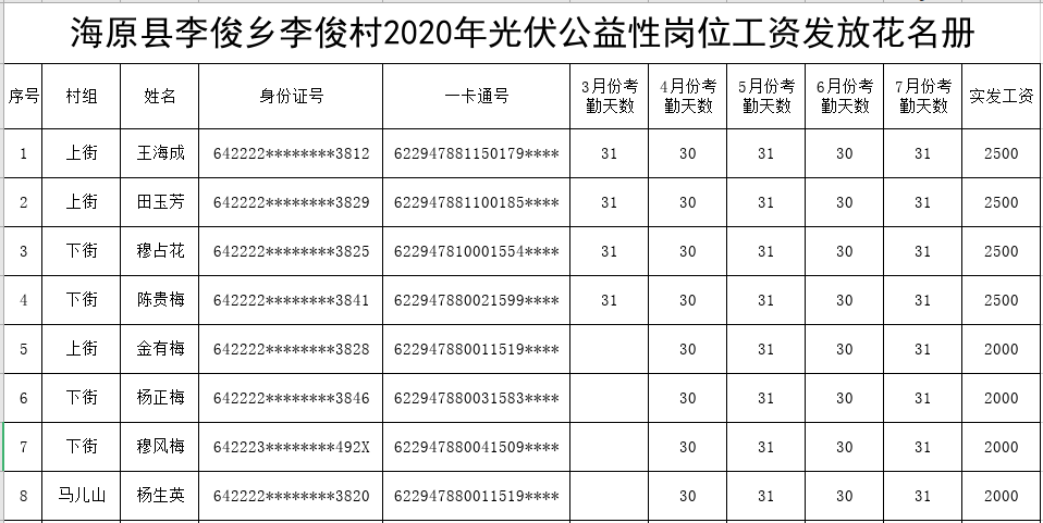 海原县李俊乡李俊村2020年光伏公益性岗位工资发放花名册