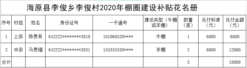 海原县李俊乡李俊村2020年棚圈建设补贴花名册