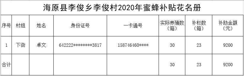 海原县李俊乡李俊村2020年蜜蜂补贴花名册