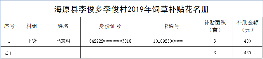 海原县李俊乡李俊村2019年饲草补贴花名册