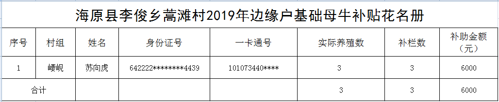 海原县李俊乡蒿滩村2019年边缘户基础母牛补贴花名册