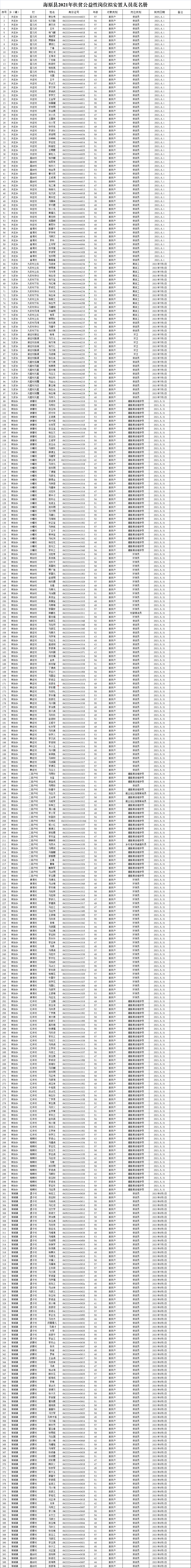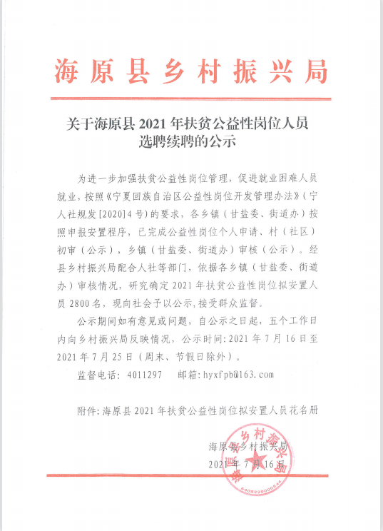 关于海原县2021年扶贫公益性岗位人员 选聘续聘的公示