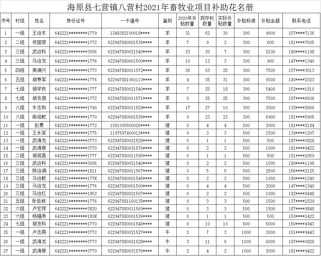 海原县七营镇八营村2021年畜牧业项目补助花名册