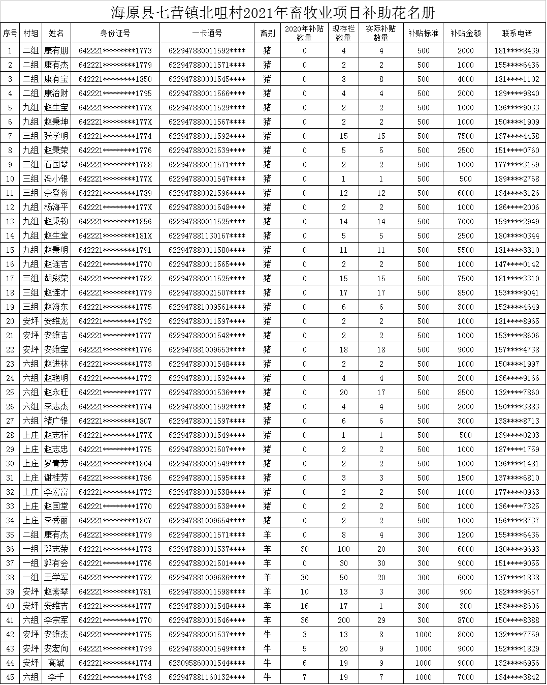 海原县七营镇柴梁村2021年畜牧业项目补助花名册