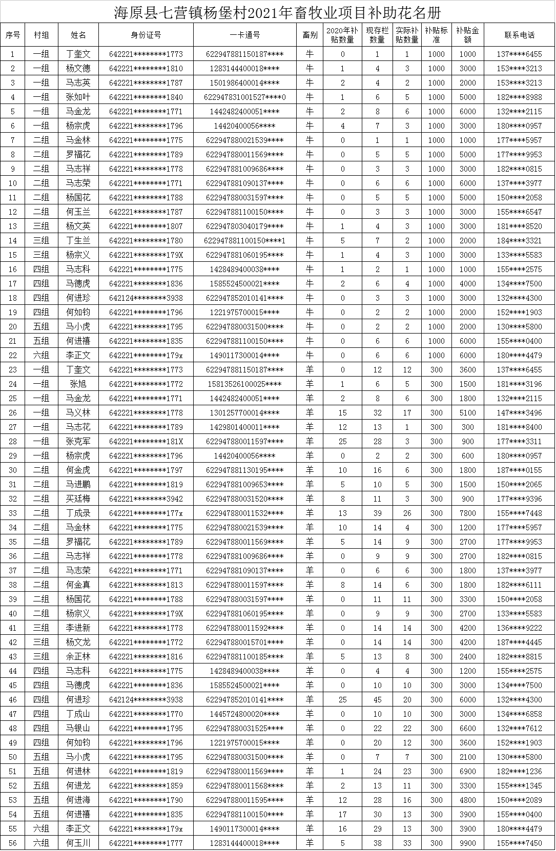 海原县七营镇杨堡村2021年畜牧业项目补助花名册