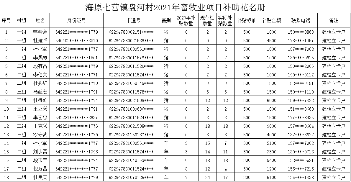 海原七营镇盘河村2021年畜牧业项目补助花名册