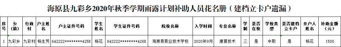 海原县九彩乡2020年秋季学期雨露计划补助人员花名册(建档立卡户遗漏)