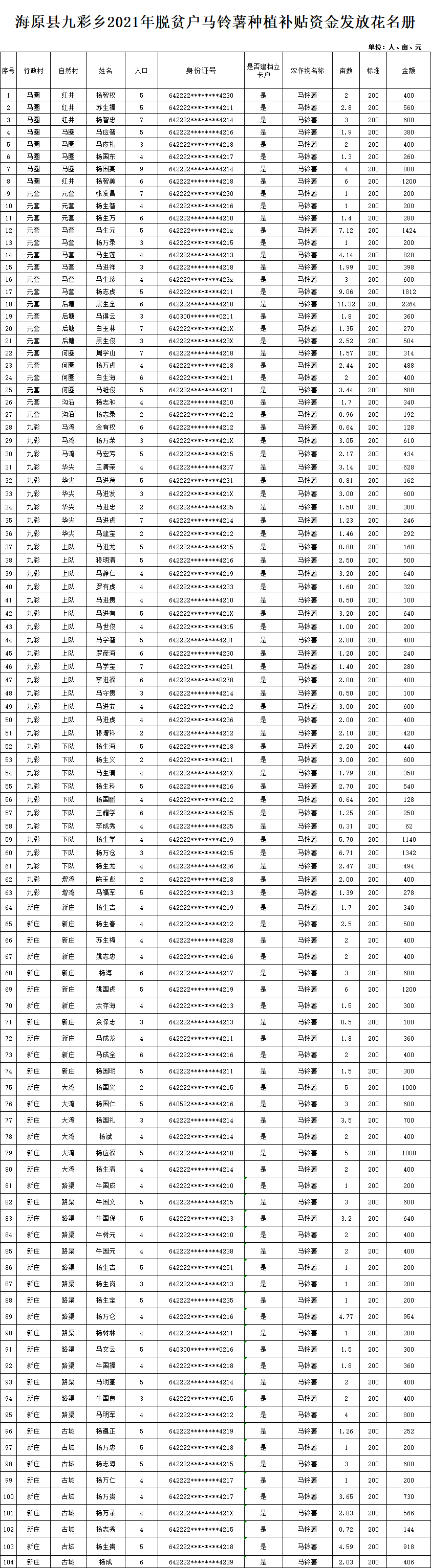 海原县九彩乡2021年脱贫户马铃薯种植补贴资金发放花名册
