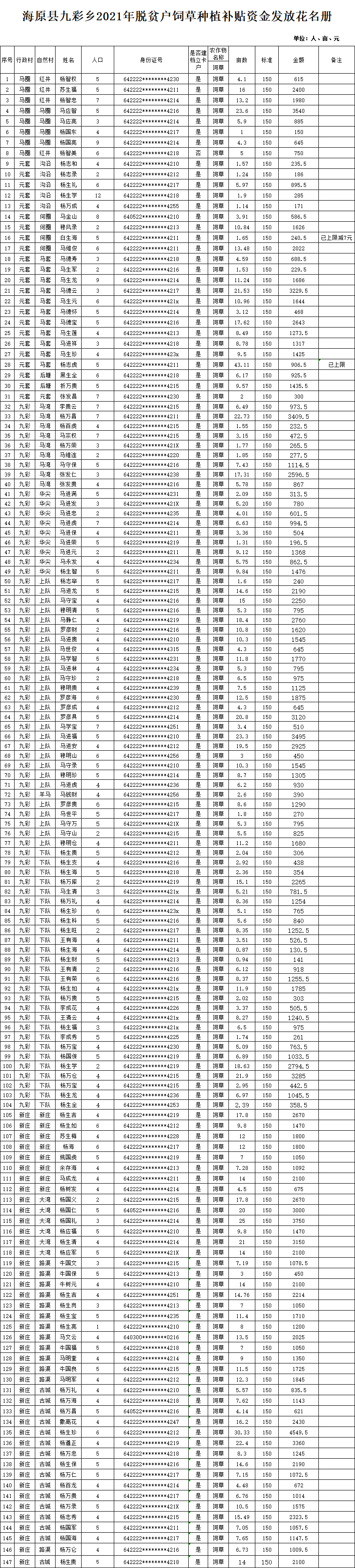海原县九彩乡2021年脱贫户饲草种植补贴资金发放花名册