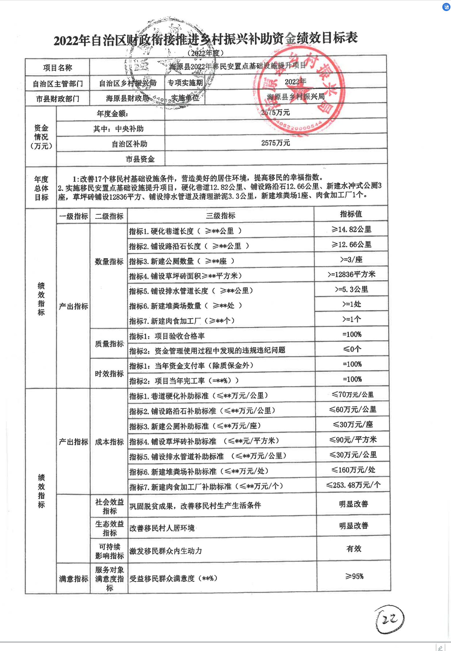 海原县2022年移民安置点基础设施提升项目绩效目标表