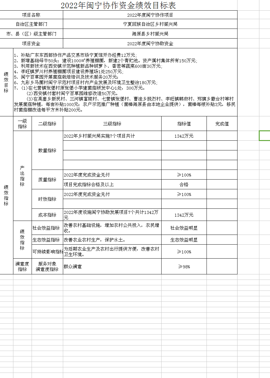 2022年闽宁协作资金绩效目标表