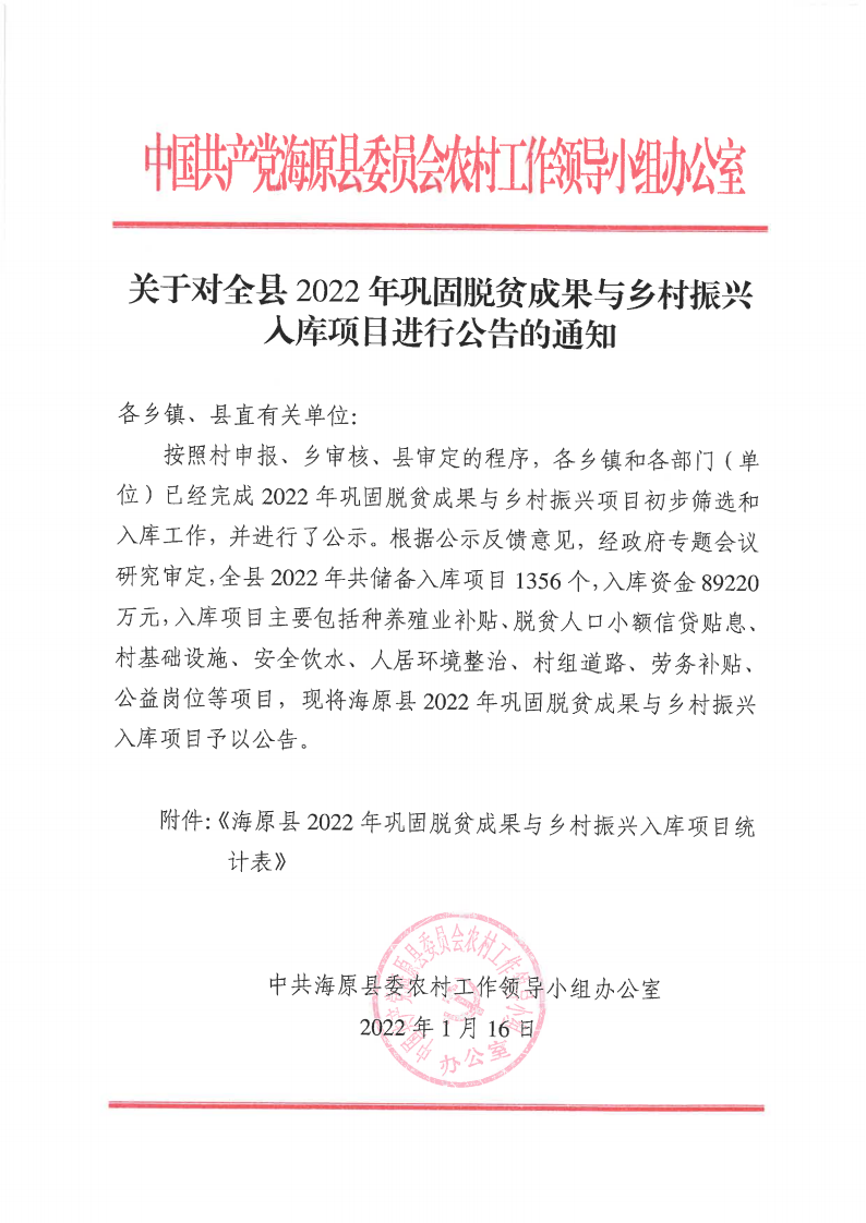 关于对全县2022年巩固脱贫成果与乡村振兴入库项目进行公告的通知