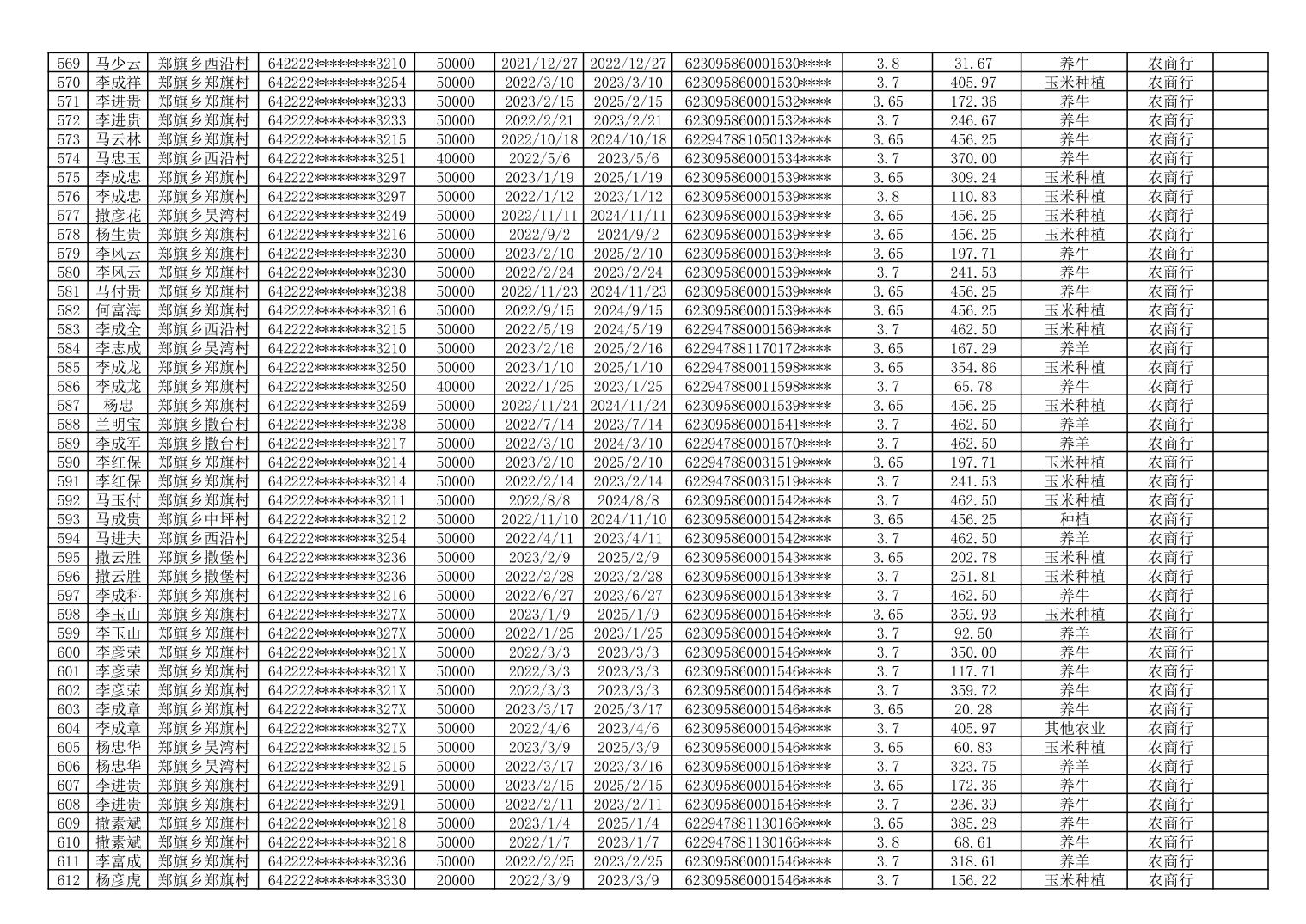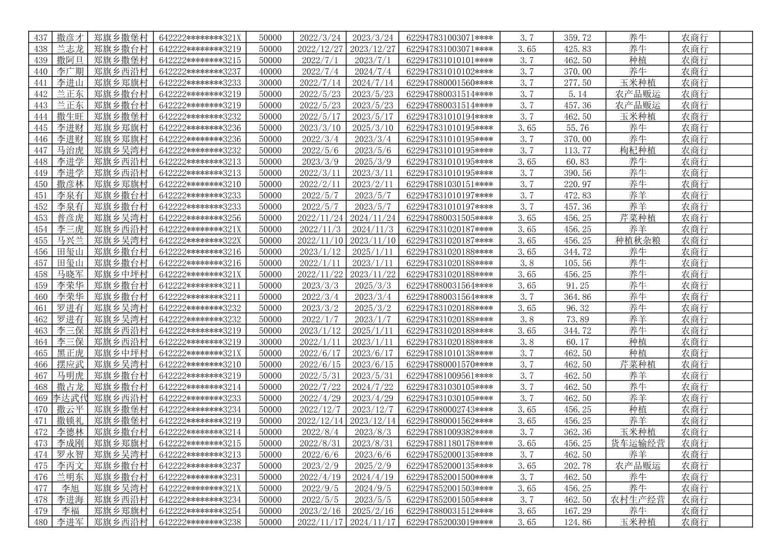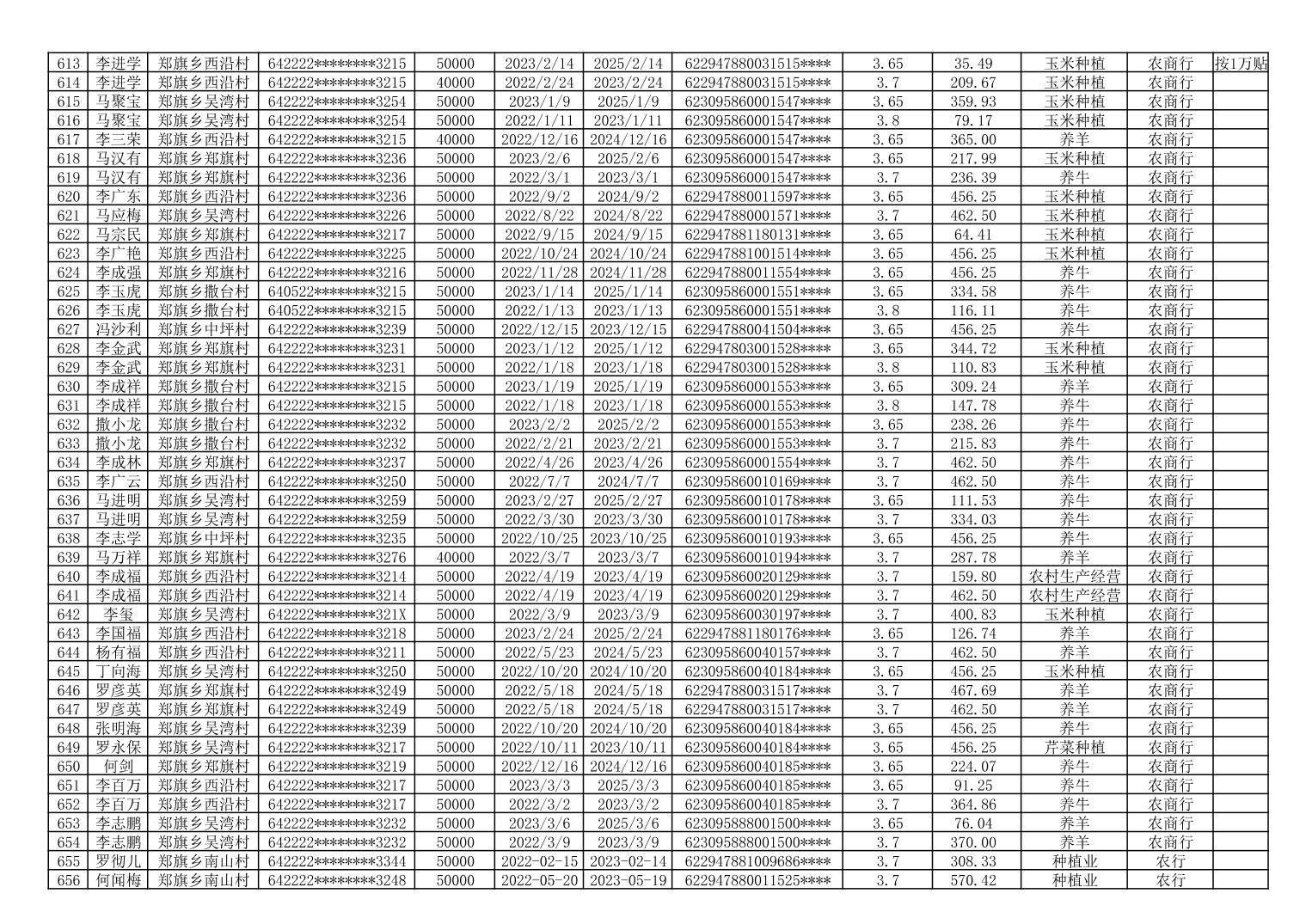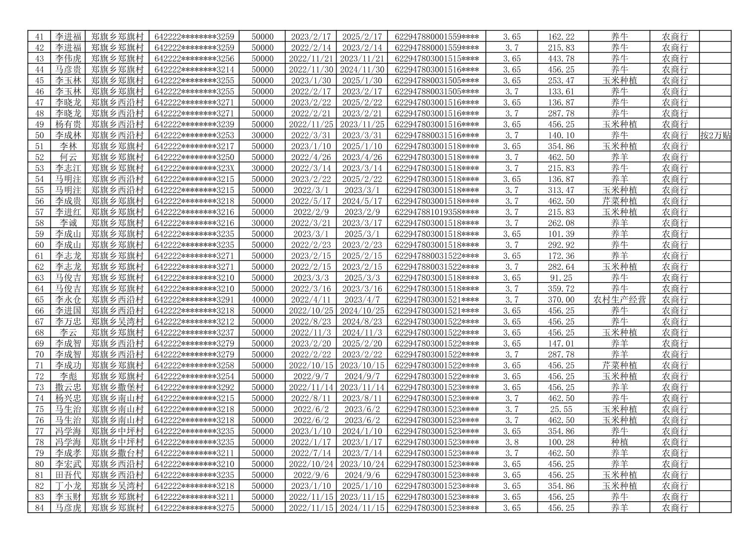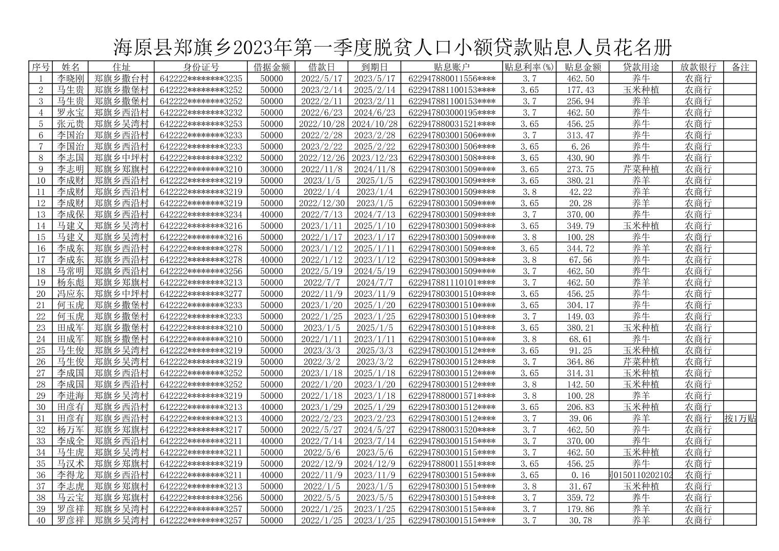 海原县郑旗乡2023年第一季度脱贫人口小额贷款贴息人员花名册