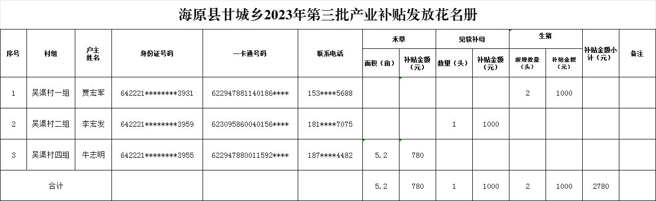 海原县甘城乡2023年第三批产业补贴发放花名册