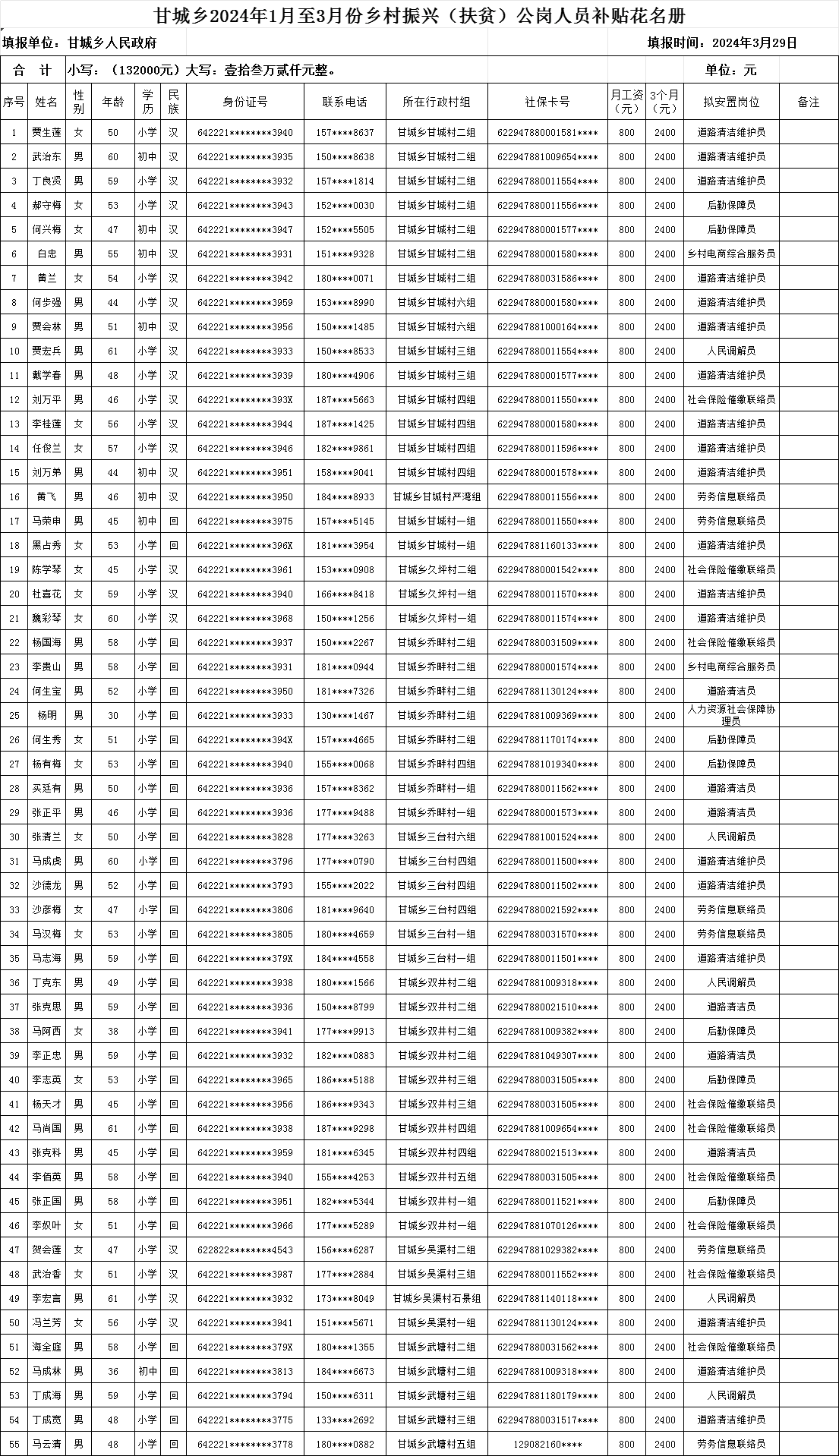 甘城乡2024年1月至3月份乡村振兴(扶贫)公岗人员补贴花名册