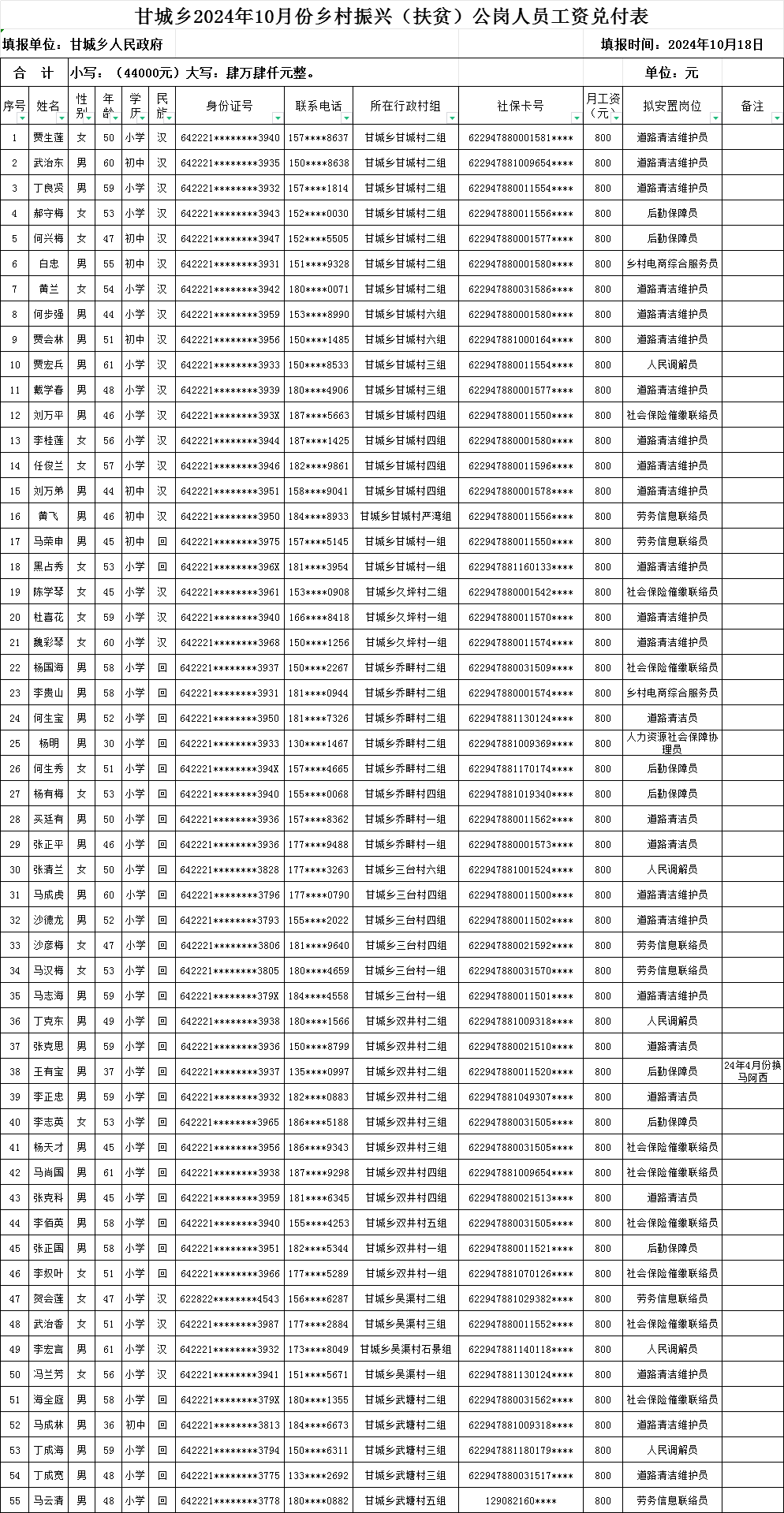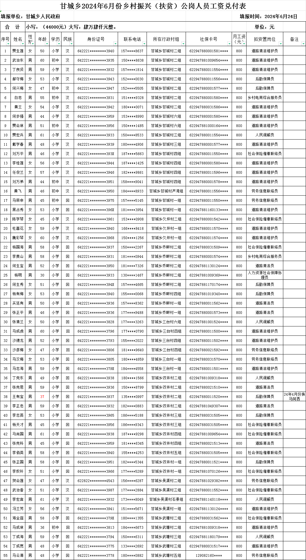 甘城乡2024年6月至11月份乡村振兴(扶贫)公岗人员补贴花名册