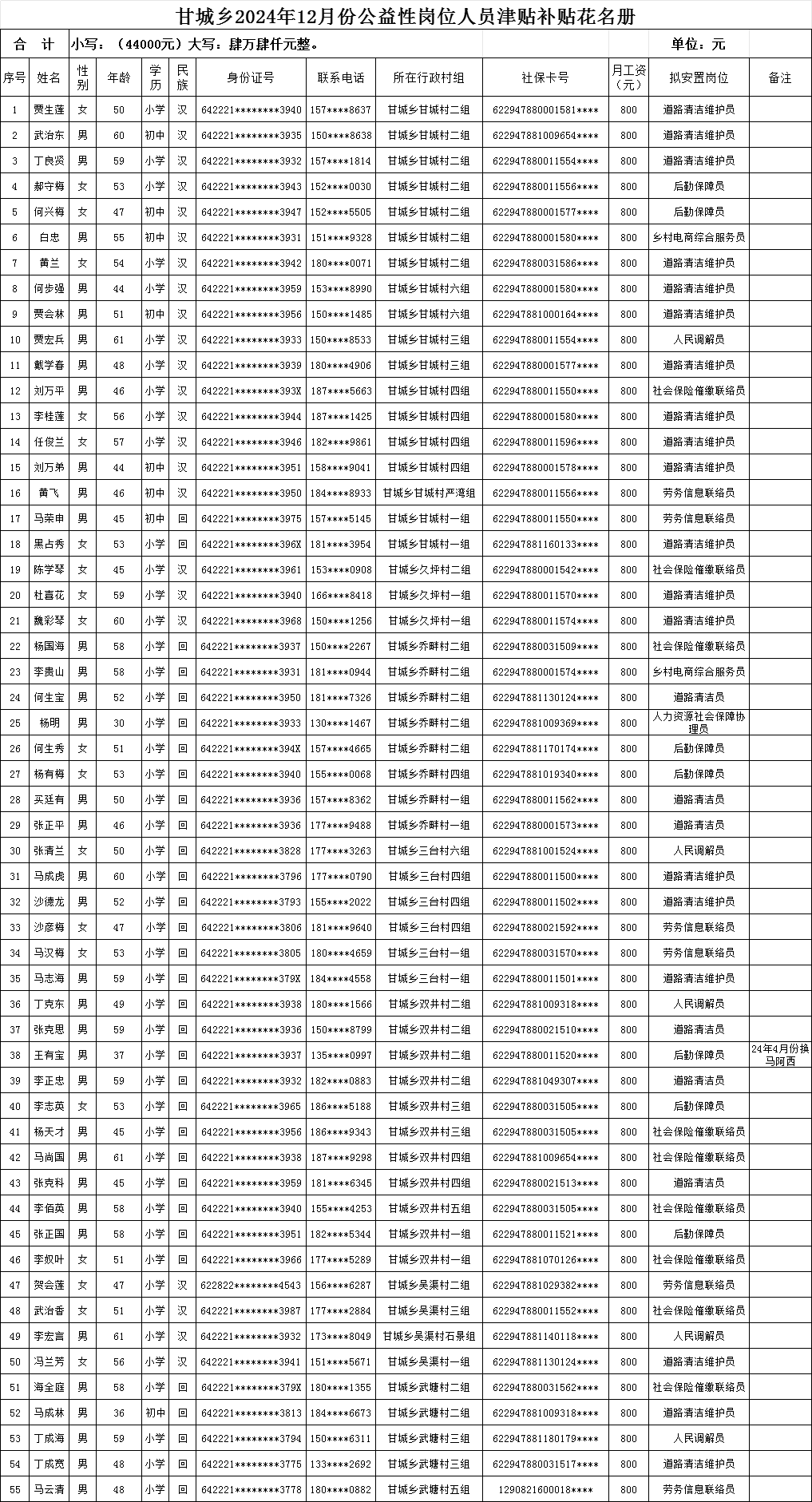 甘城乡2024年12月份公益性岗位人员津贴补贴