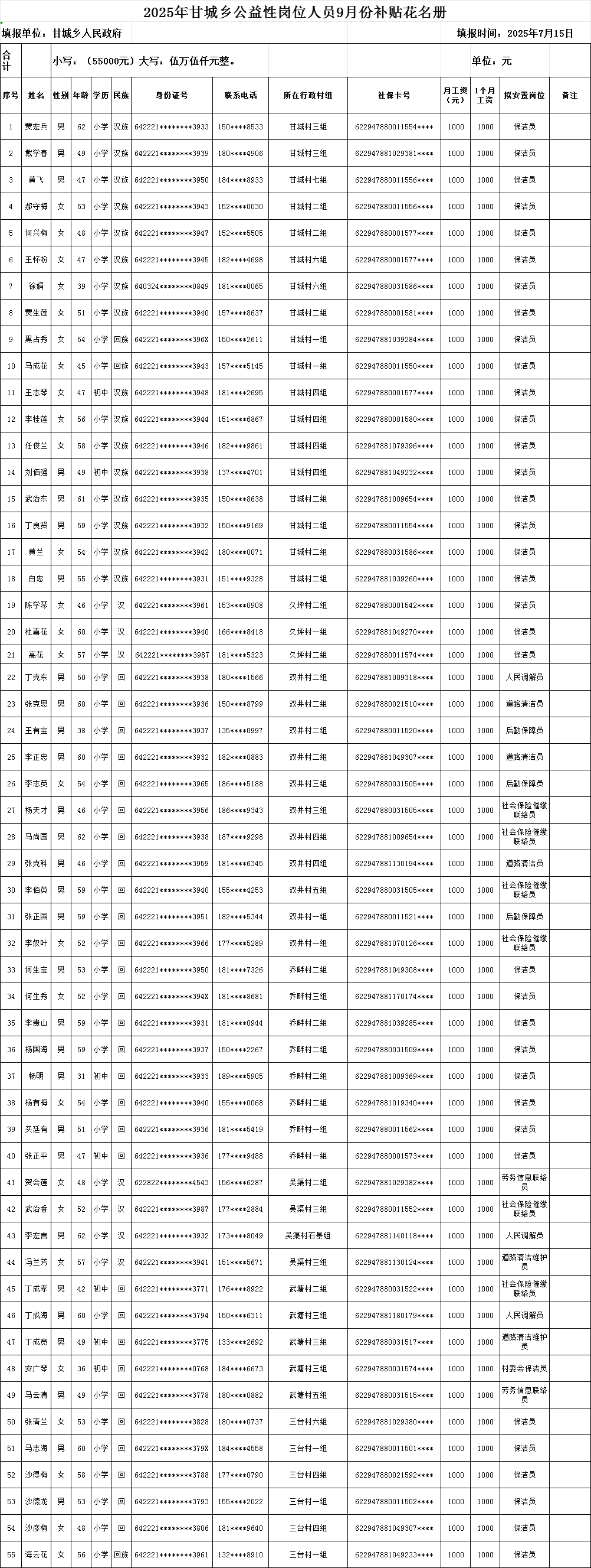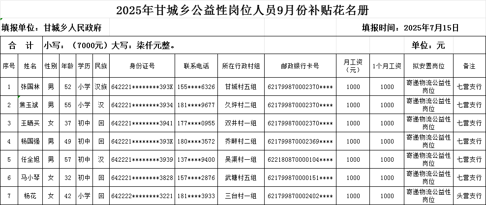 海原县甘城乡2025年公益性岗位人员7-9月份补贴花名册