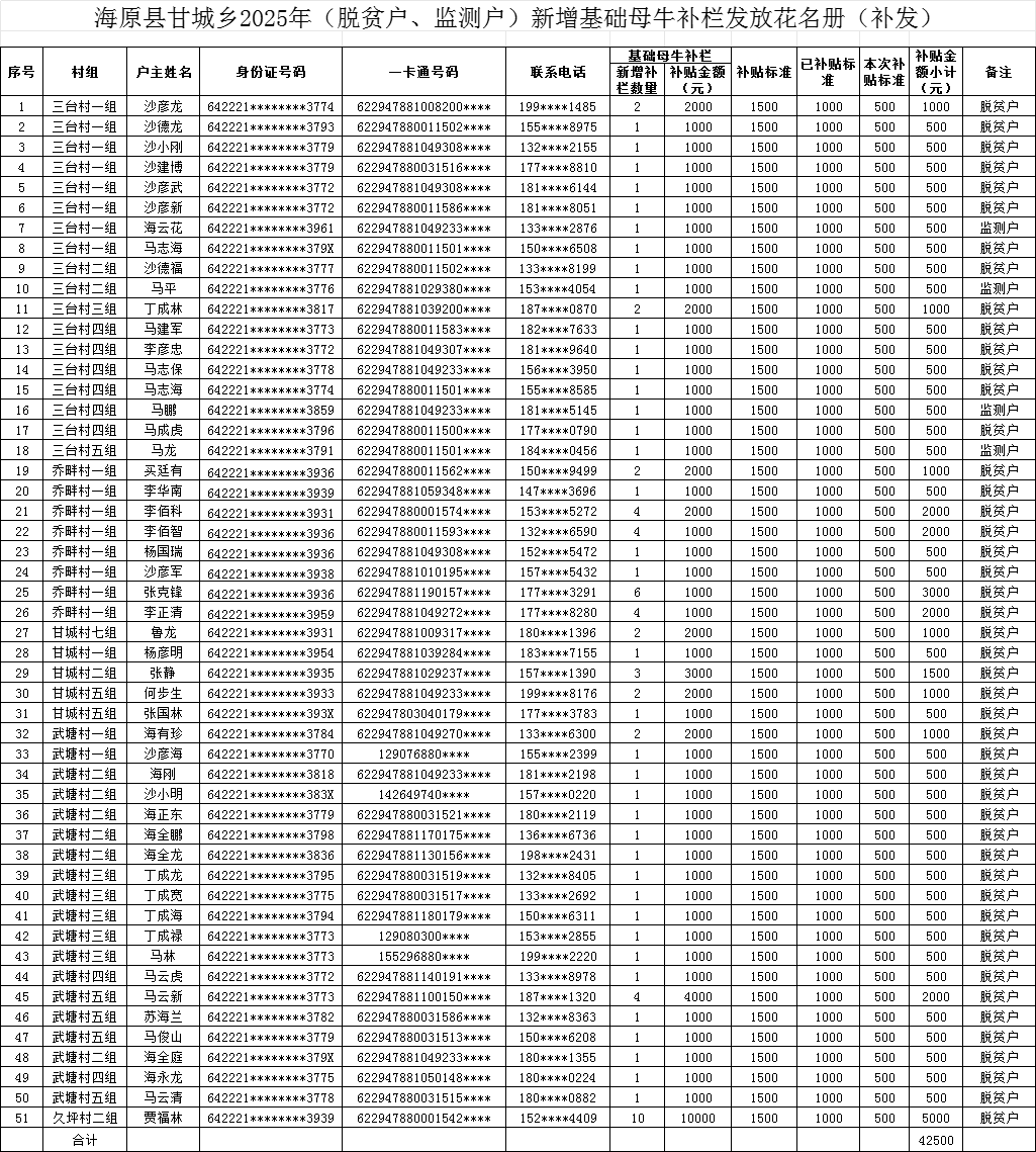 海原县甘城乡2025年(脱贫户、监测户)新增基础母牛补栏发放花名册(补发)