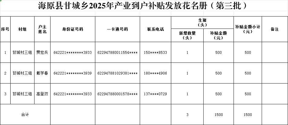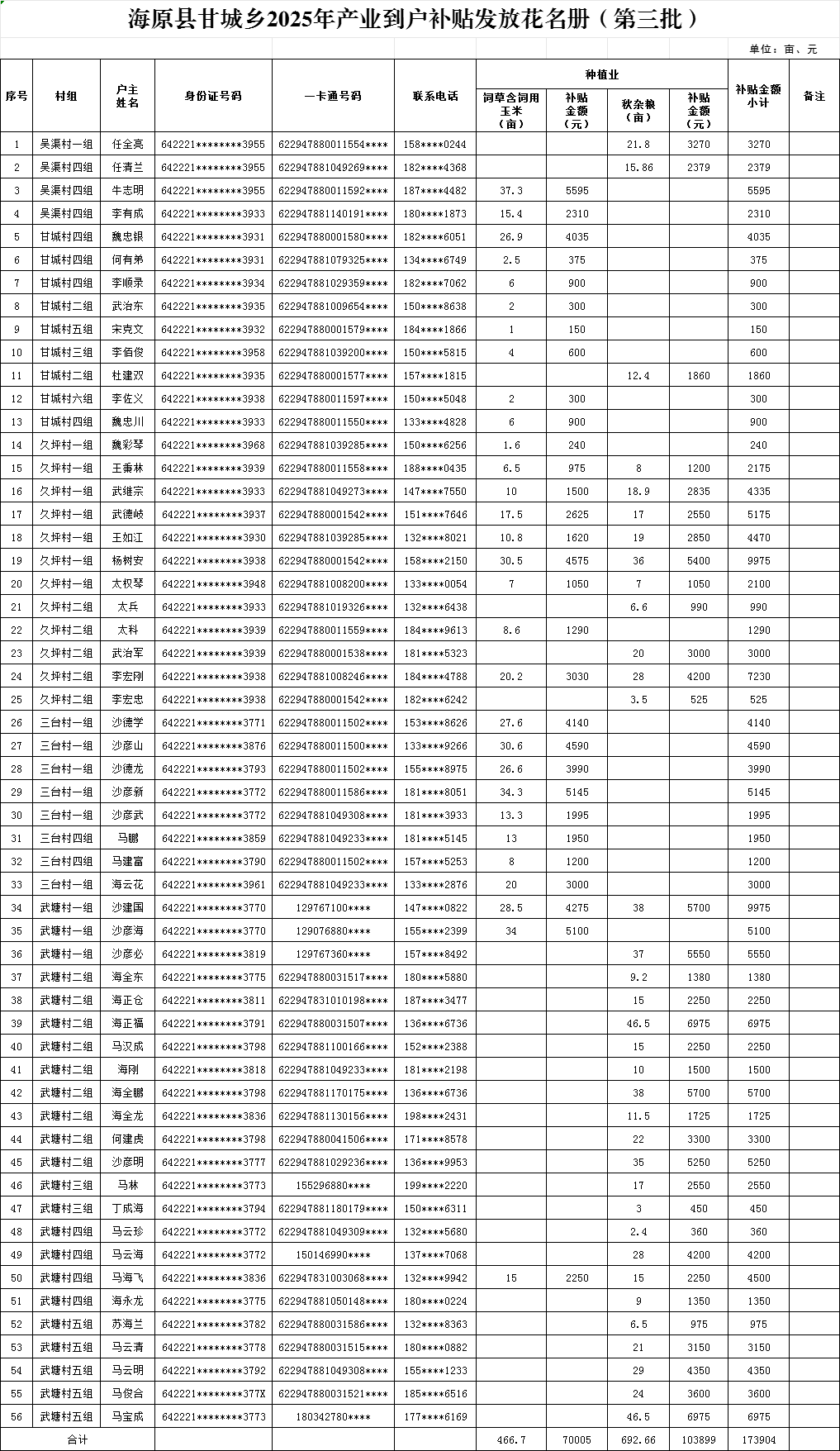 海原县甘城乡2025年产业到户补贴发放花名册(第三批)