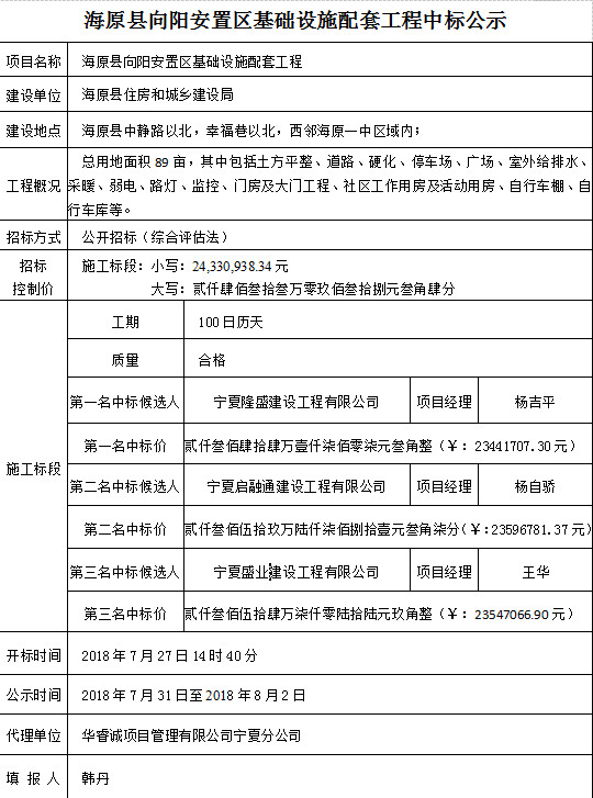 海原县向阳安置区基础设施配套工程中标公示